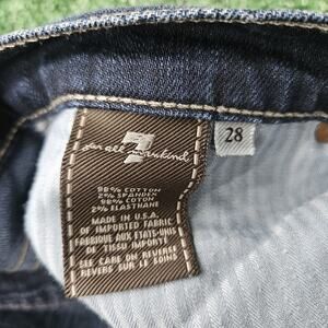 The product is a pair of ladies' 7 For All Mankind Roxanne slim low rise blue jeans in size W28 with a 33-inch inseam. These vintage-inspired jeans feature a zip closure, 5-pocket design, and are made from a cotton blend denim fabric. The slim fit and low rise cut offer a flattering silhouette, while the dark wash and embroidered logo accents add a touch of sophistication to the casual look. Perfect for everyday wear, these designer jeans are machine washable and have a stylish slim leg design.