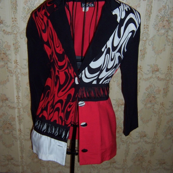 Stunning ladies accent jacket in bold designs of red, white and black. Made by Adddiction, size Medium. Great condition and great accent jacket.