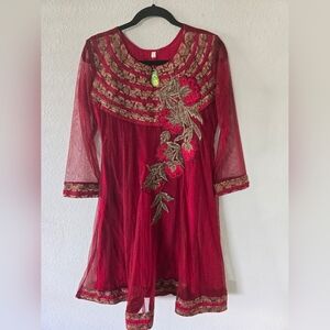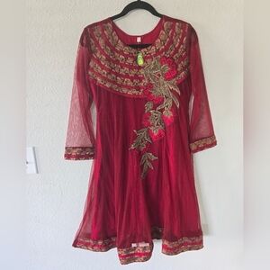This beautiful red dress with intricate embellishments is perfect for any special occasion. The dress is made from a mesh blend material and is designed in the style of an Indian salwar kameez. It is a size S and fits perfectly for women. The dress is gentle to care for and can be hand washed easily.