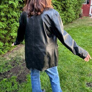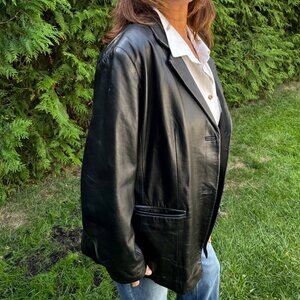 Gently wornJaclyn Smith Studio genuine leather ladies blazer size Large. Two buttons, two pockets and a breast pocket. It measures approx 47" just under the arm pit across the bust. The length down the back is approx.30" from the top of the collar. It is a fall or spring weight jacket, lined with a satin. The model wearing it is 5" and weares a medium or large.