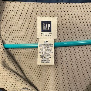 I'm offering this Ladies Blue Fall/Spring Rain Jacket. It's made by The GAP, is a size 2XL. and has a zip up front with Velcro fasteners.