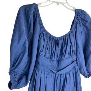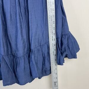 Such a gorgeous mini Peasant dress beautiful blue color with sash tie in the back and ruffled hems. Balloon arms with elastic neckline to be worn up or off shoulders. Measurements in pics. In great condition!