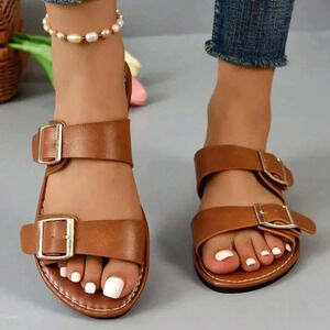 Ladies' Buckle Decorated Elegant Brown Flat Sandals