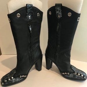 Gorgeous and sexy! Capelta like NEW, worn maybe twice. Leather, Black/Silver, Grommets, Studs, Western Vibe. Heel 3.5 inches. Size 36 which is usually a 6. Top of calf hits approx 13 inches from floor. Inside zip but in the middle, not to top of boot, see photos. Made in Brazil. Bottom a bit dirty/dusty but no other flaws that I can see. Comes in original box with original packing. May be additional postage if shipped in original box. These are stunning! Would keep them but... these darn bunions