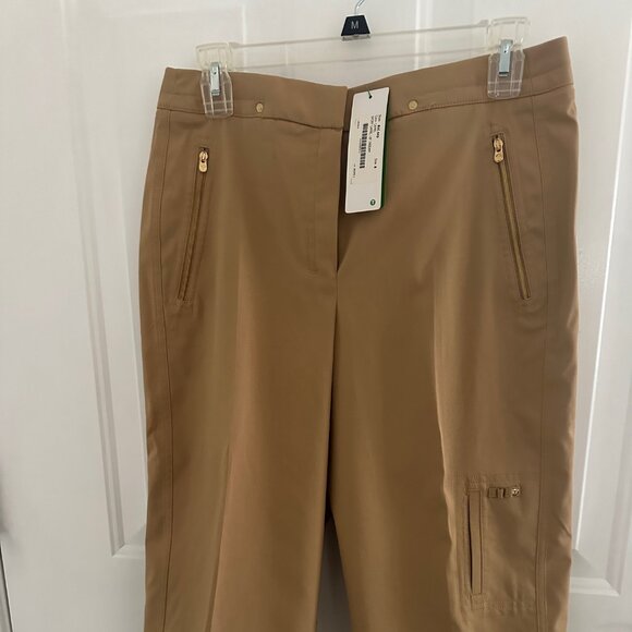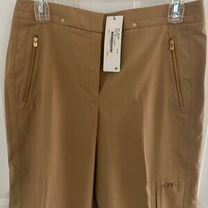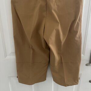 Capri length, Camel color.. Zip front pockets., cargo style pocket at knee. Zip front. with slit pockets in the back. Also they have a draw string pull at the leg bottoms.