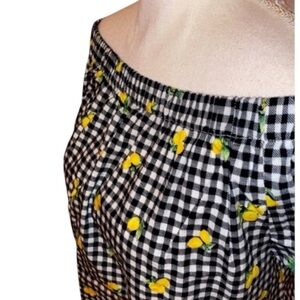 This Chloe + Rene features a gingham patterned off the shoulders design with adorable lemons featured throughout the blouse. Both sleeves are cap style sleeves with a tied keyhole feature as well as an elastic neckline.