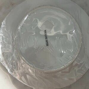 Box has minor tear, plates are unused and sealed. Box = 9.5 inches diameter, plates = 8 inches diameter.