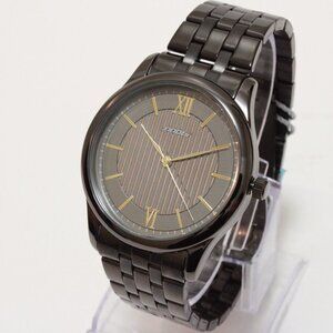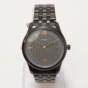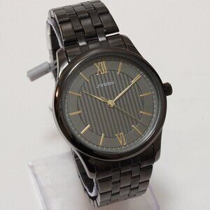 Ladies classic style casual quartz watch in all black with textured dial, gold indices and Roman numerals at twelve and six o'clock. It has a Japanese quartz movement in a 33mm black case, held in place by a black bracelet. It can be sized to fit wrists up to 7 inches. This watch is new in box and works perfectly.