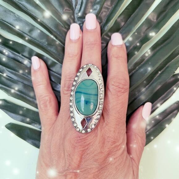 Unique & Fabulous stunning Silverstone ring. Has white colored stones surrounding the large faux turquoise. In person it is stunning.