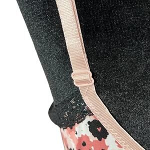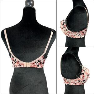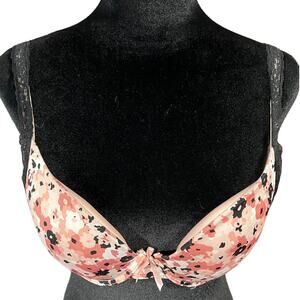 Women's push-up underwire bra in a pretty floral print in pink, white and black. The tag is very hard to read but I think it says Jaclyn Smith. Could be an A cup, B at most. Adjustable straps. Black lace on the straps. Due to light & screen variations, colors may vary slightly from the images