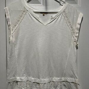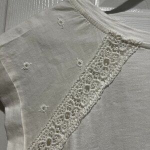 This adorable blouse is feminine and fun. It's White with some eyelet and lace accent. Only been worn a time or two, it's an excellent staple ready to start adventures with you!