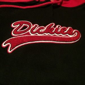 Ladies fit hooded Dickies sweater / sweatshirt! Textured logo across chest, pictured! Black with red sleeves, logo, & hood! Small slit at the top of the neckline (see pic 2) so that it opens a bit looser than a reg hoodie.