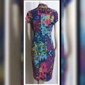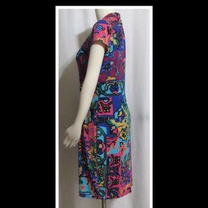 This is an extraordinary boldly colored abstract geometric patterned silky stretchy fully lined cap sleeve faux wrap knee length dress by ELLEN TRACY. It is brand new, in perfect condition and a size 8