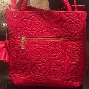 Beautiful and Stylish Bright Red Handbag embossed with embroidery flowers and lots of detail. This beauty has 3 compartments inside and an outside zipper for addition storage such as pens, keys, lipstick etc. She is absolutely gorgeous, never been used because I bought 2 and she does come with a shoulder strap for your convenience.