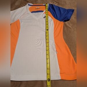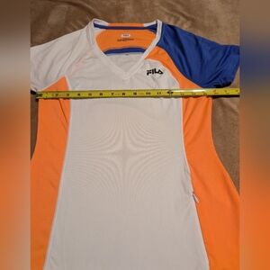 Ladies Fila Sporty Dry Fit White, Orange & Blue Work-Out Top - small, fits like small - see photos like new, no call-outs (I've always hand washed my work-out tops, hang dry)