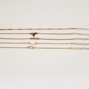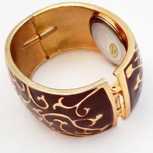 Ladies Geneva Quartz metal cuff watch with an exquisite brown & gold colored filigree design. AND 5 lovely delicate gold colored metal chain bracelets, each with a different charm: a Horseshoe; a Leaf, 7 Square Balls; an Elephant; and Scattered Beads. Worn together, they make a real fashion statement, or wear separately. Comes in a nice brown nylon gauze pouch. Cuff Watch: 1-1/8' wide. Hinged to fit most wrists. Battery Included. Bracelets: 7" with 2" extension. Small lobster claw clasp.
