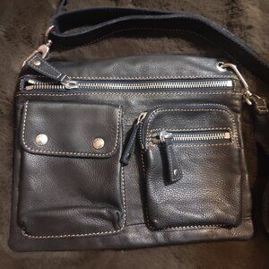 Ladies Gray A. Bellucci Genuine Patent Leather Large Handbag. Officina artigiana 85 pell leather cuir 15 Polyester. Shiny Gray. This does not have any additional straps only the handles attached. There are snaps where you can add some if you find any replacement or ones that may fit if you would like to use as a shoulder bag. Very nice quality handbag very roomy!
