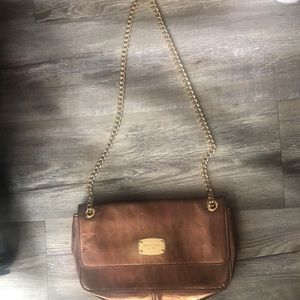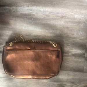 Bronze color, several pockets inside for cards and identification and golden chain.