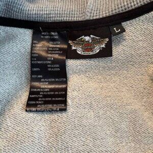 Ladies Harley Davidson Black Cotton Jacket with Removable Gray Vest Large. This 2 in 1 cotton jacket and vest set is in excellent condition. The jacket has zip closure and has 5 outside and 2 inside pockets. The removable gray vest has 2 pockets. Has Harley signage on back, arm and wrist. Measures 20" pit to pit and 23" in length. Non-smoking home.