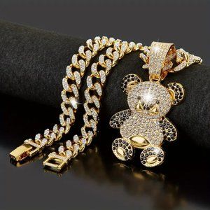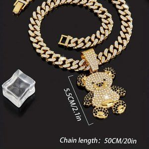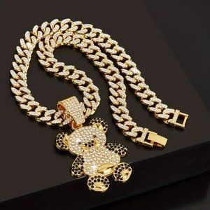 Ladies Hip Hop Cute Bear Pendant Rhinestone Cuban Chain Necklace Animal Shiny