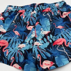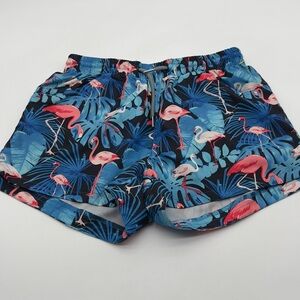 Ladies ~ Hot Coals ~ Tropical Blue Leaf Pink Flamingos Print ~ Swim Shorts ~ M