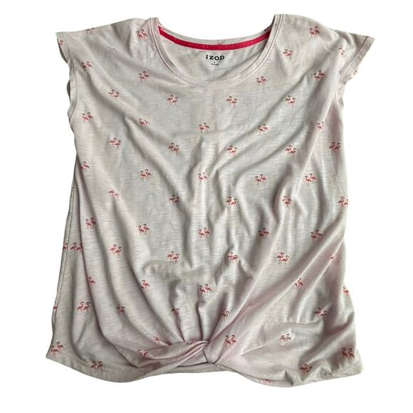 Ladies IZOD brand tee shirt top - size L - medium PINK top with dark pink flamingos printed all over. Short sleeves - scoop neckline - knotted front detail. Soft polyester rayon jersey fabric. Gently worn - no flaws.
