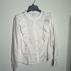 Ladies J CREW BLOUSE WITH HEARTS & RUFFLES.. Size large in excellent condition.. armpit to armpit 22”