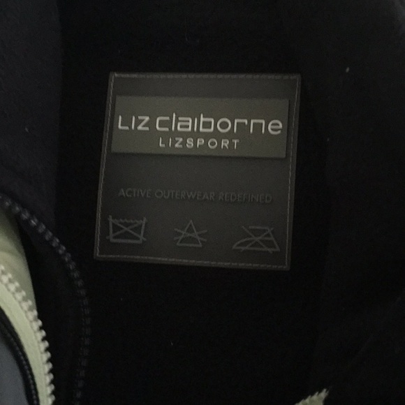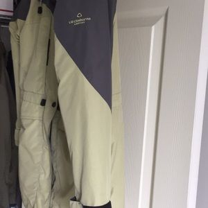 Ladies jacket/raincoat, Liz Claiborne Lizsport, zip in lining with snaps in sleeves to hold lining in place, detachable hood, grey at top of sleeves and on collar, pea green. Has tie at waist, inside pockets and deep side pockets
