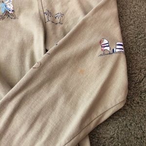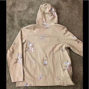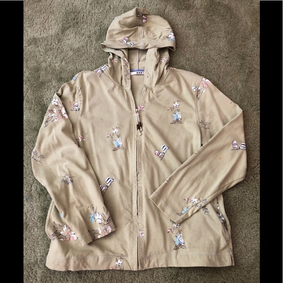 Lightweight Ladies Jacket in an Olive knit. Great for all day wearing. Jacket has a hoodie but the tie is missing. There is a small stain on sleeve as shown.