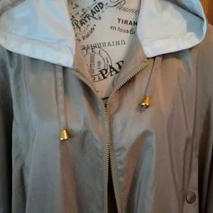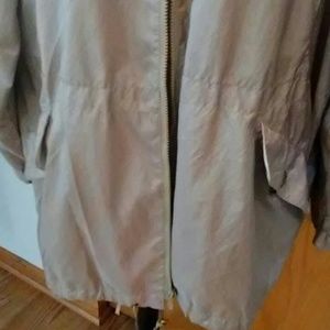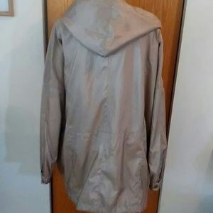 ladies lightweight hooded jacket , approximately 33 inches long from the shoulder down to the hem, four pockets , drawstring around tail of the jacket