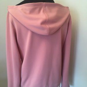 Perfect for outdoor activities or just walking the dog this light weight ladies jacket with a hood for those cool evenings or mornings is available for your immediate use when a heavier coat is just a little too much. The jacket is a blend of polyester, (93%) and Spandex (7%). The color is a soothing light pink or salmon with a black interior liner in the hood.