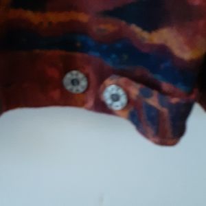 Fabulous colors on this 100% cotton jacket. Beautiful silver patterned buttons down the front and on tabs at bottom.