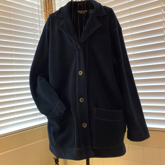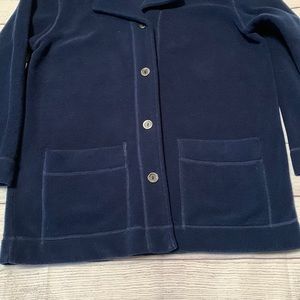 Silver Lake Ladies unlined jacket. Button down front loose fitting with two front pockets. Material is a soft fuzzy Navy Blue.