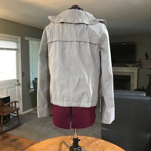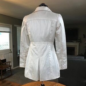two rows of 4 buttons for the double breasted look, two pockets, a bit of a shine to it, Very classy looking!