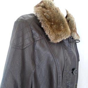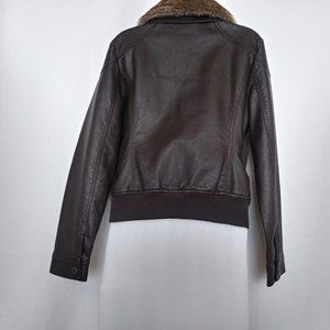 Women's Bomber Faux Leather Brown Jacket Size XL Detachable faux fur collar Zip Up front with 4 large buttons 2 zipped pockets Stretch waist