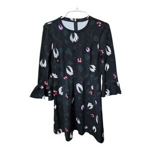 Ladies size Medium. Color is primarily black, with pink, green, and white color throughout. In good, gently used condition. Features a zipper on back. Dress is approx. 35 inches in length.