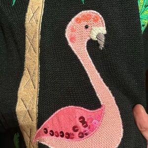 Beautiful ladies black Summer/Spring sweater featuring palms and flamingos with sequins and hand stitching