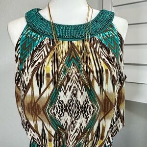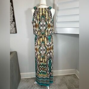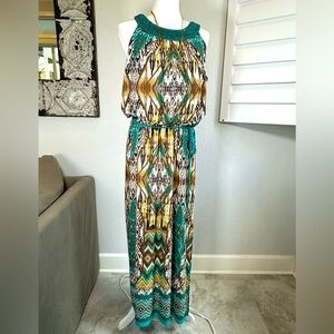 Cute long dress will travel without wrinkling! String belt, side slits, beaded top (missing a few beads but not noticeable)