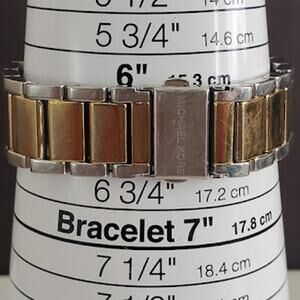 Michael Kors women's watch is silver tone with a gold tone bezel. Dial is mother of pearl with gold accents and surrounded by crystals. Band is silver and gold tone and shows signs of wear that can be seen in the pictures. Currently running with a fresh battery.