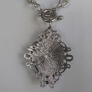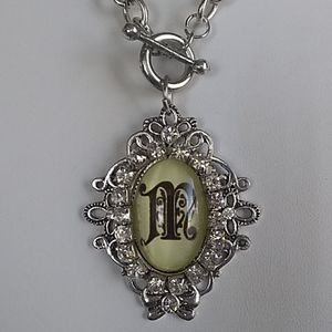 This is a NWT Ladies' Old English Monogram Initial Silver-Tone Toggle-Closure Necklace for the letter "M". The pendant features a bejeweled filigree frame (about 1-3/4" W x 2-3/16" H) around a plastic-domed Old English letter (the letter is about 5/8" H). The chain is approximately 19" long (exclusive of the hasp and the pendant). It's a great Valentine's Day gift!