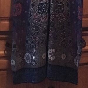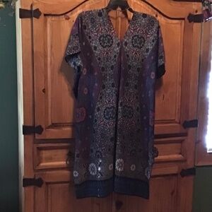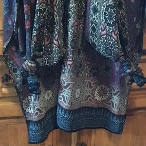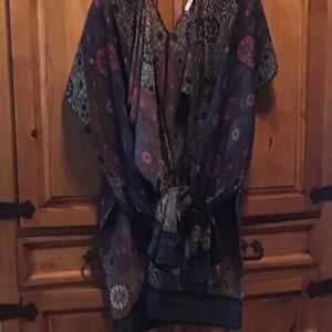 Gorgeous print with blues, plums, purples and black are so cute on this stylish cover-up kimono. It’s oversized and can be worn straight or tied to add style. It has a V neck with tie in back, and swags down to hem. Back length from bottom of “V” to hem is 35”. Front length from shoulder down is 42” if not tied. The sides are slit for easy knotting. Tag reads S/M but it is oversized quite a bit. I wear an XL and it was rather big but once I tied the front it really did the trick. Very cute, soft fabric. Please note the fabric type is 100% polyester, not very legible on tag.