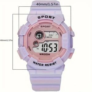 This stylish woman's multifunctional digital watch features a sleek and vibrant design, blending soft shades of pink and pastel blue. The durable silicone strap offers comfort for all-day wear, while the large, easy-to-read digital display provides a variety of functions such as time, date, alarm, and stopwatch.