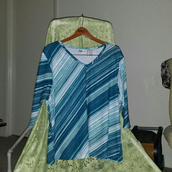 Soft, flowing,, shades of blue, aqua & white, diagonal stripped top. Great with jeans for a smooth look! Top has 3/4 sleeves.