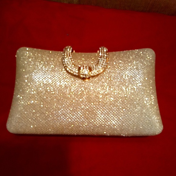 New Lustrous Metallic Gold Hardshell Evening Handbag With Crystal Clasps Closure