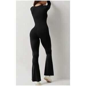 Ladies Qinsen Black Square Neck LS Wide Leg Bodycon Romper Jump Suit Size S