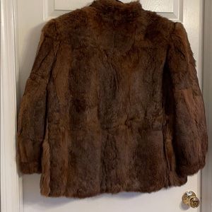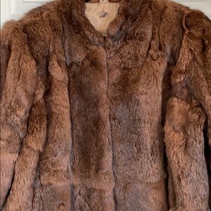 Beautiful rabbit fur! No tears (other than small tear in lining at neck..see pic). Lining is secure with no tears, smells or stains. (see pic) No size tag but I am sure it is an