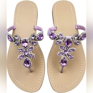 Ladies flat rhinestone sandals has purple stones along with a bag of extra stones in case u have to replace some. They are a size 8 but feel they run a little small. I feel they can fit someone with narrow feet wearing a 7-1/2. They are brand new, never worn just tried on.