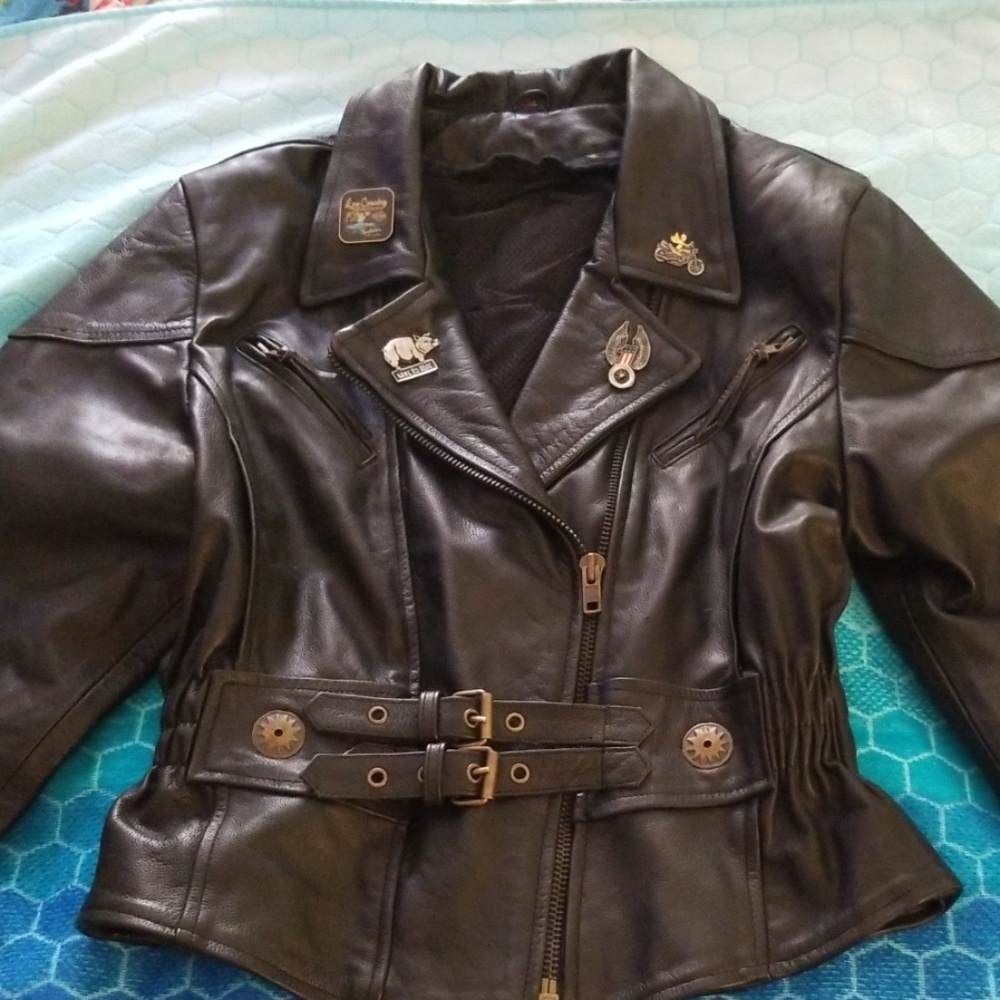 In great condition, all zippers work, has patch on back, has pins on collar.