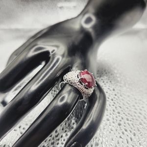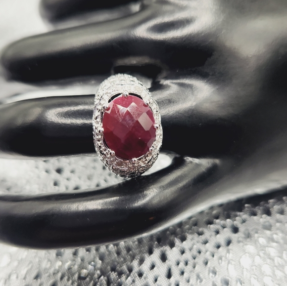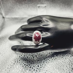 A truly classical east - west designed red ruby with diamond accents. The oval cut ruby is 4.61 ctw and 0.02 round diamonds on either side. Ring is 14 kt white gold over solid sterling silver. This is a beauty! Ring is stamped .925 inside of the band
