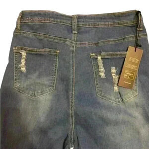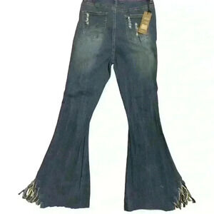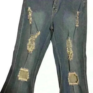 Stretch blue jeans size large. Flare legs. Pockets in front and back. Raw hem. High waist.